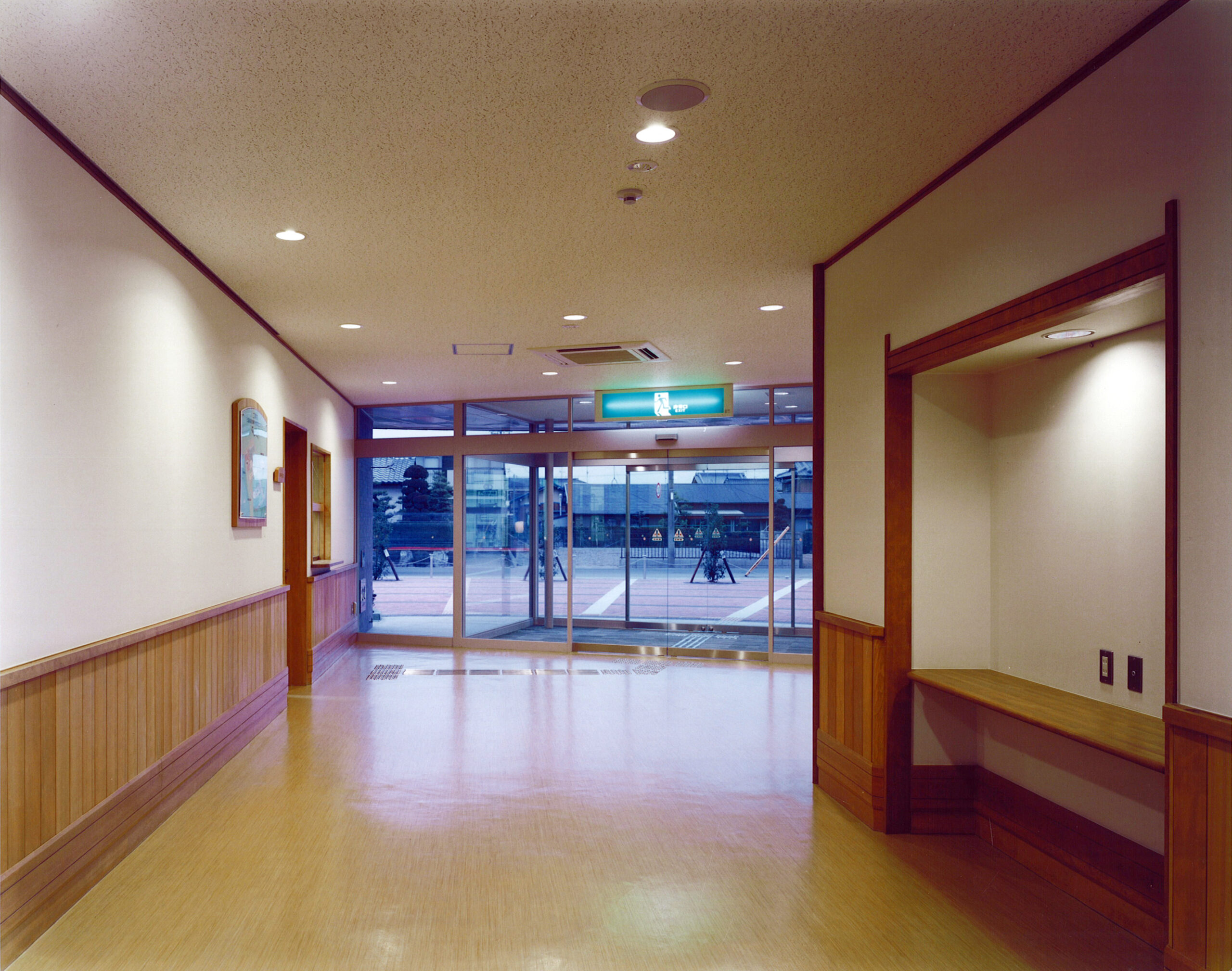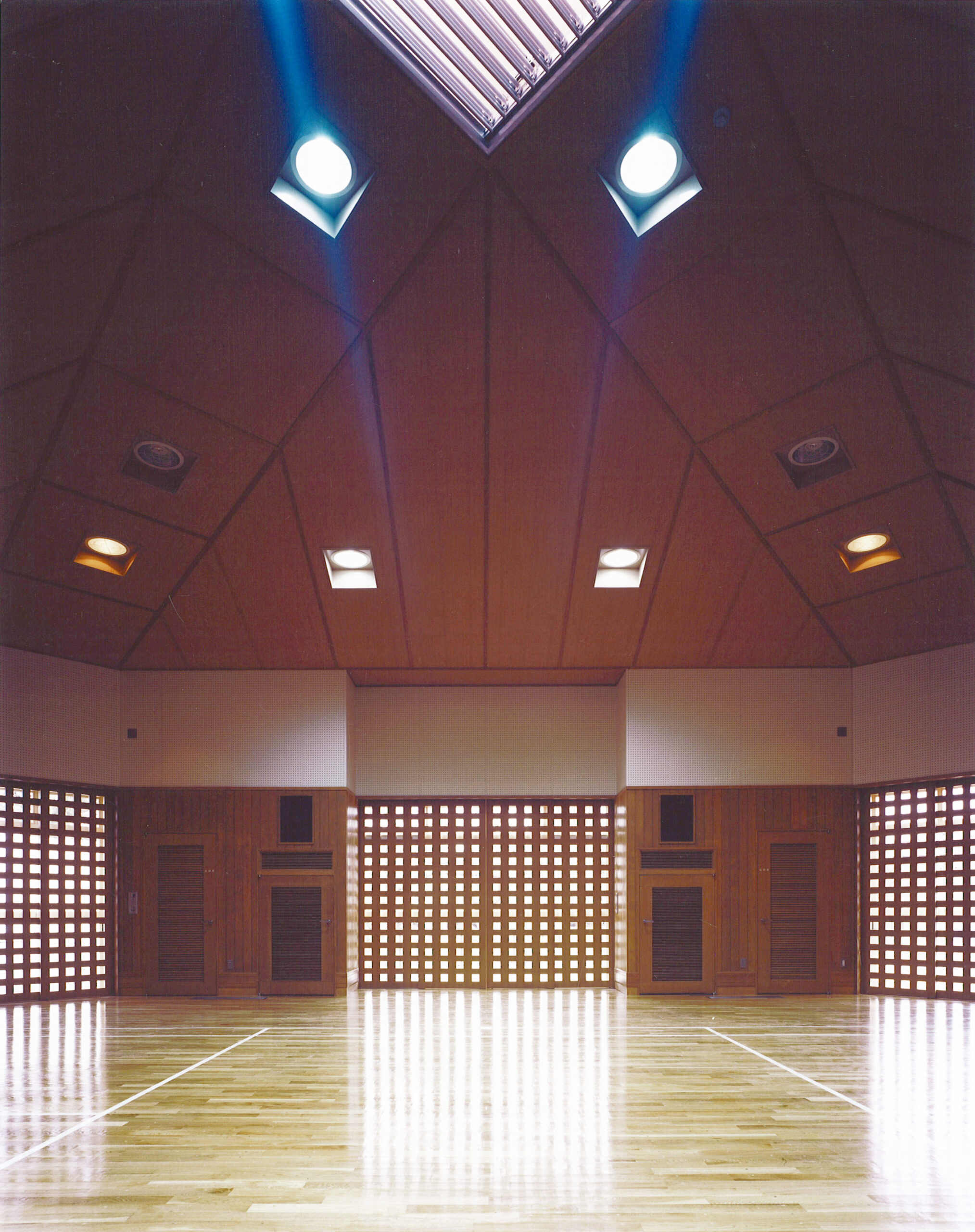 障害者更生施設「樹心寮」の建替えに伴い「更生相談所」を併設させ、知的障害者の生活を総合的に支援する県内の拠点施設です。配置計画では3つの段階的ゾーン(パブリック、セミパブリック、プライベート)と明確な導線を基に、各々ゾーンの間に広場を設け、地域との交流を深めるスペースに活用し、また、プライバシー保護や採光・通風等を十分取り入れる空間構成となっています。アプローチ広場に面した多目的ホールは施設の「核」となる空間で、地域住民にも開放し障害者との交流の場となります。大きく緩やかなカーブを持つ屋根とシンボリックなトップライト、木を多用した内部仕上により、明るく親しみやすい建築を目指しました。