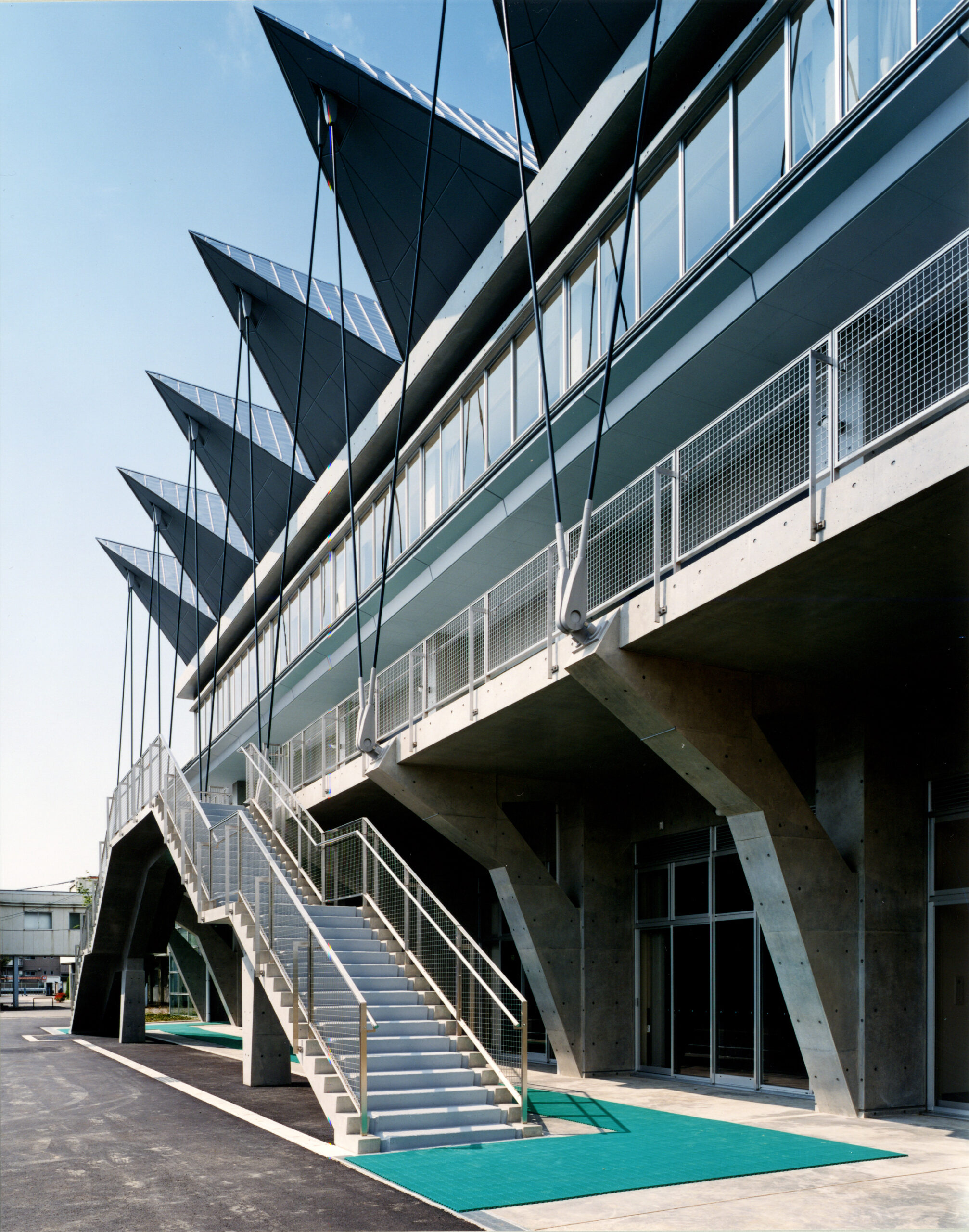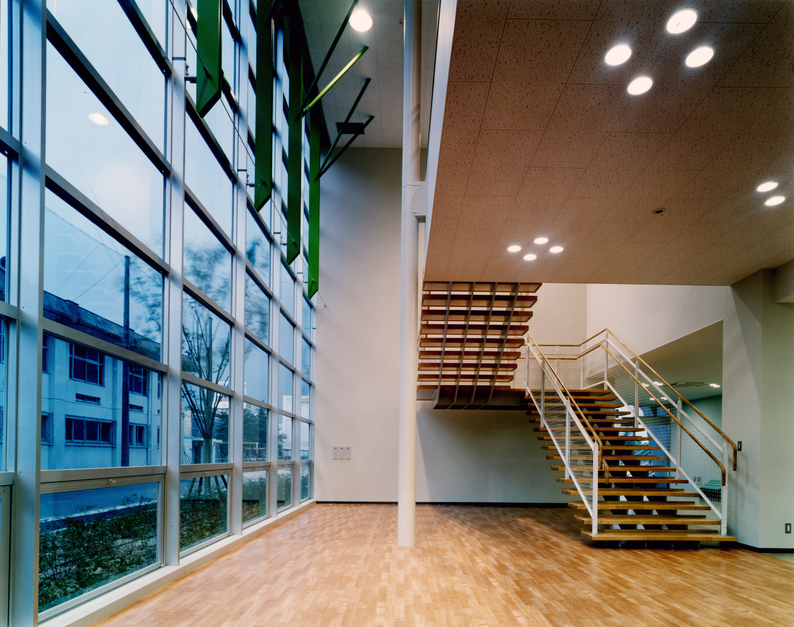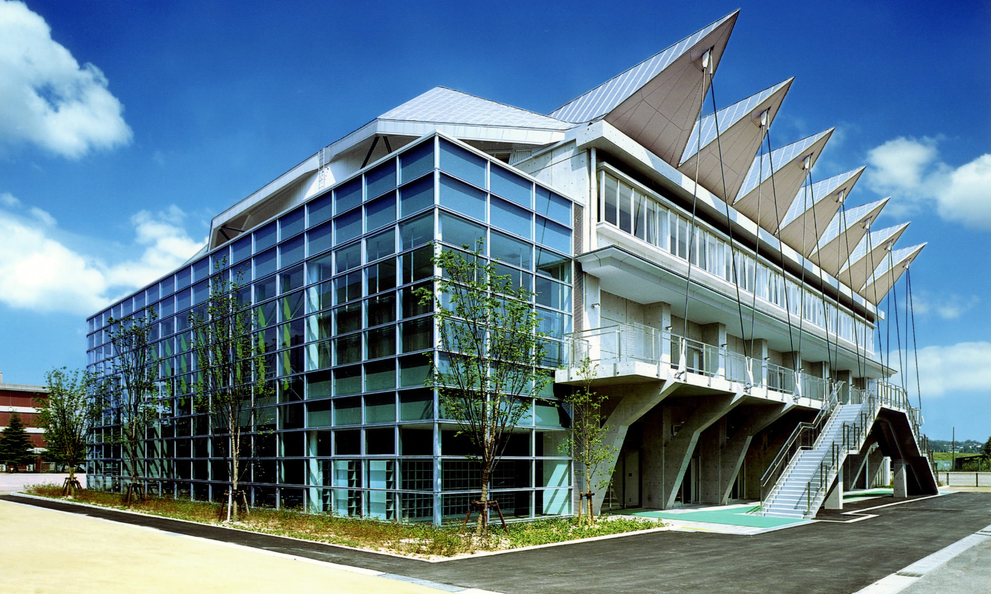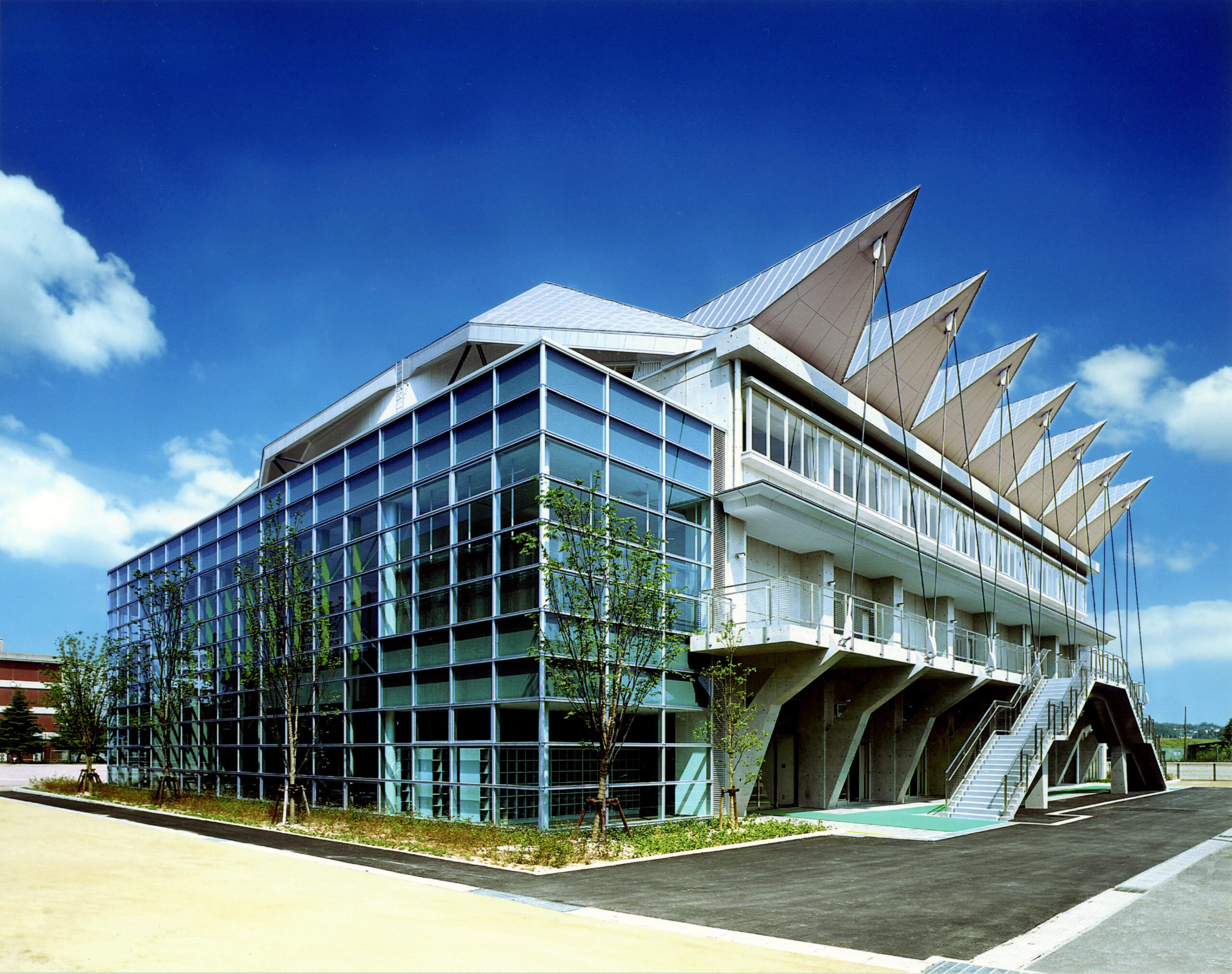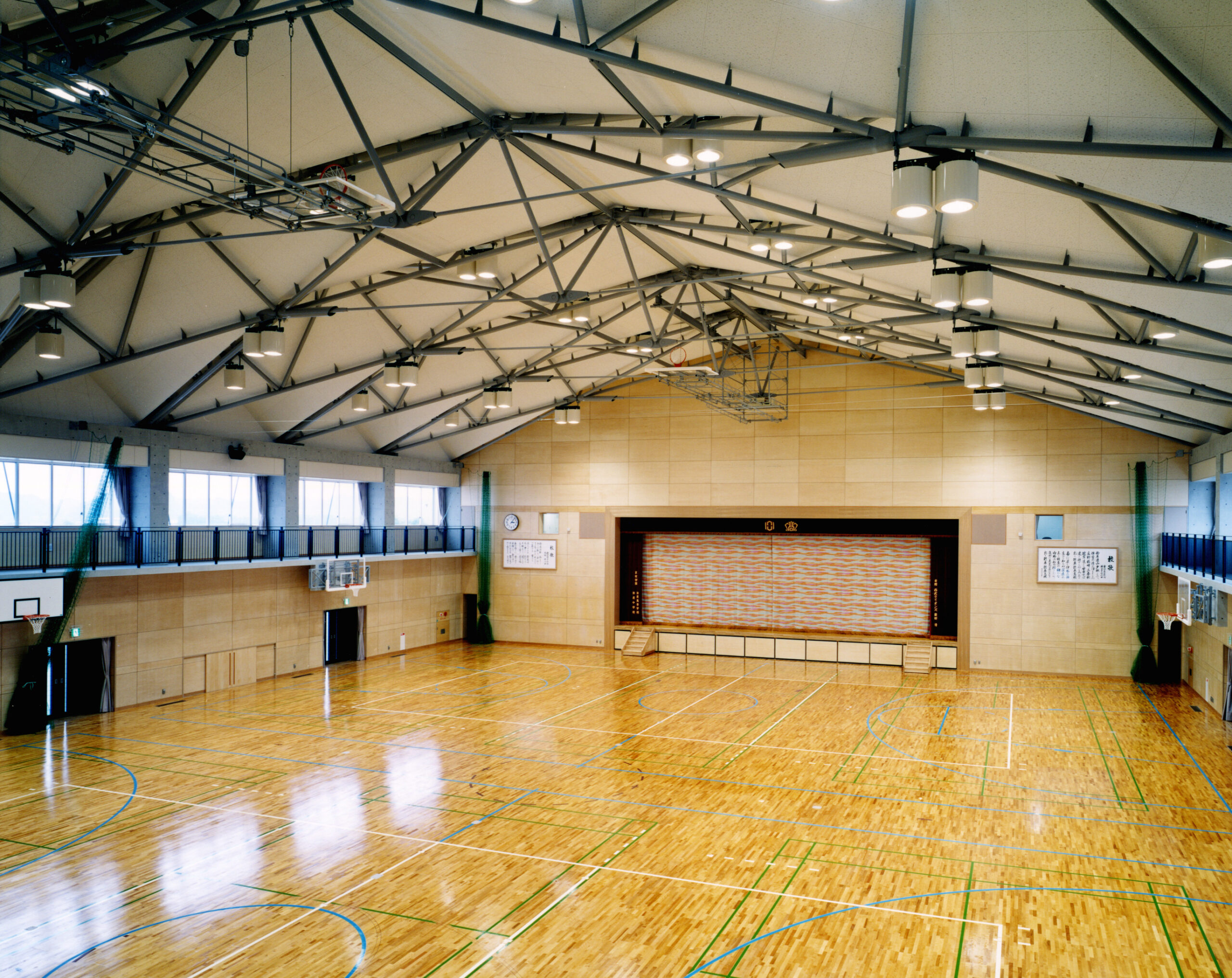 生徒一人一人が個性を活かし、自ら学ぶ場となる施設を目指し、明るく開放的な建物になるよう計画しました。1階には40周年記念館としての小ホールとトレーニングルーム、2階はメインアリーナで構成され、エントランスから吹抜けと一体になったホワイエを介し各室へと導かれます。外観のデザインにおいては、ホワイエ内部の人の動きがわかるように建物正面をガラス貼りのカーテンウォールとし、屋根はトラスと張弦材のハイブリットシステムとすることでその形態に躍動感を持たせます。アリーナに集まる生徒たちが学び、語らい、そして巣立っていく、そんな生徒たちの羽ばたいていく姿の想いと、鈴鹿山脈を思わせるルーフデザインとを重ねてかたちとしました。