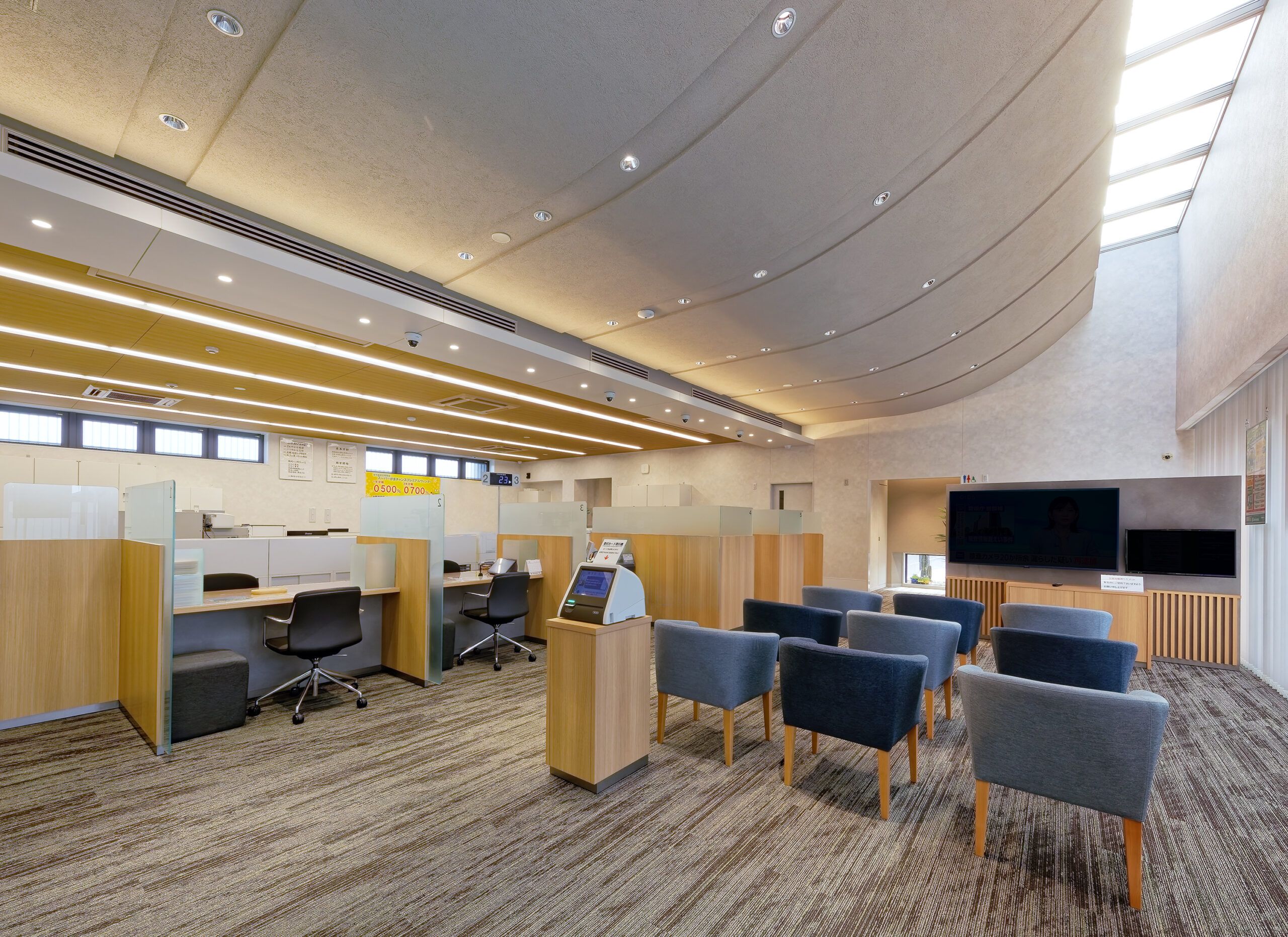 ロビーは柔らかく光を取り込むトップライトと曲面天井により、いつまでも居たくなる心地よい空間とすることで、地域の方同士のコミュニケーションの場にもなるよう意図しました。